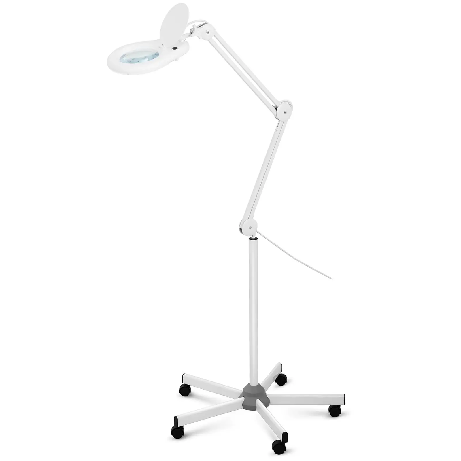 Le trépied pour lampe-loupe en acier robuste, peint par poudrage, de couleur blanche est d’une grande aide au quotidien. Grâce à ses cinq roulettes en plastique qui présentent un fonctionnement fluide et pivotent sur 360°, le trépied se déplace avec aise et sans bruit. De plus, il peut être saisi et déplacé à partir de n’importe quel côté. L’assemblage de la lampe-loupe sur pied est on ne peut plus simple : il suffit d’insérer la tige inférieure du bras articulé dans l’ouverture supérieure du trépied anti-basculement et déjà le tour est joué.